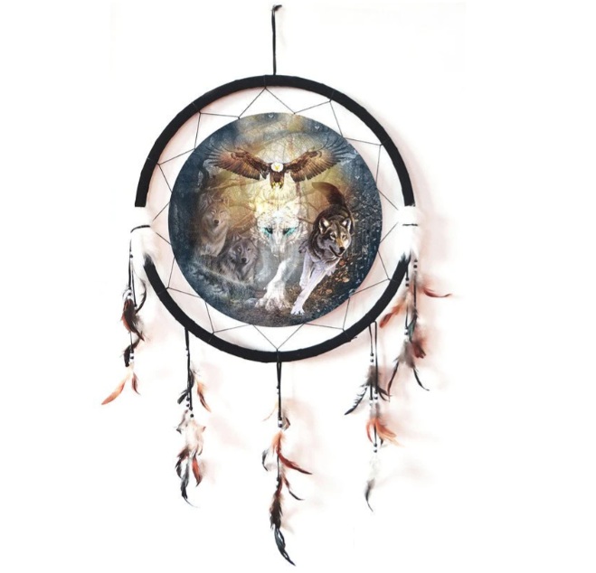 Capture the spirit of the wild with this striking 24" dream catcher featuring vivid artwork of running animals. Handcrafted with care, it blends traditional symbolism with powerful imagery to bring protection, balance, and natural energy into your space. Perfect as a bold decorative piece or a meaningful gift for nature and wildlife lovers.