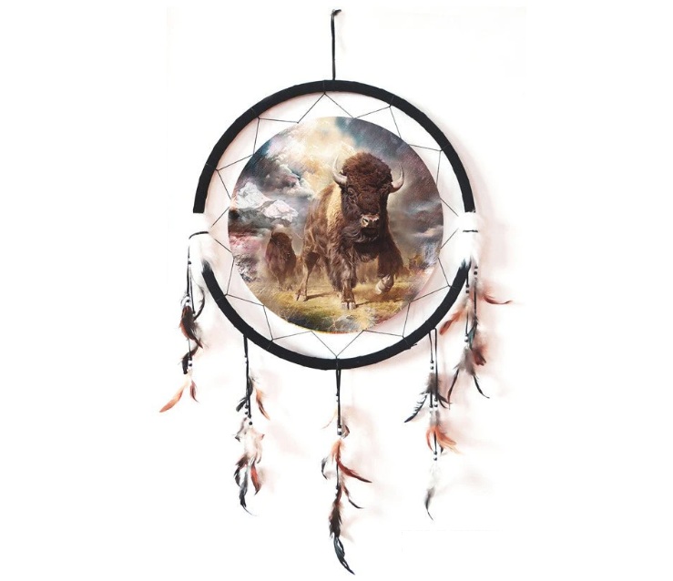 Honor the strength and spirit of the plains with this 24" dream catcher featuring powerful imagery of running buffalo. Handcrafted with natural materials, it blends traditional symbolism with bold design to protect your dreams and ground your space.
