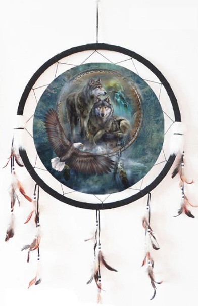 Embrace the spirit of the wild with this 24" dream catcher featuring majestic wolves and a soaring eagle. Symbolizing freedom, strength, and unity, this handcrafted piece brings both visual power and protective energy to any space.