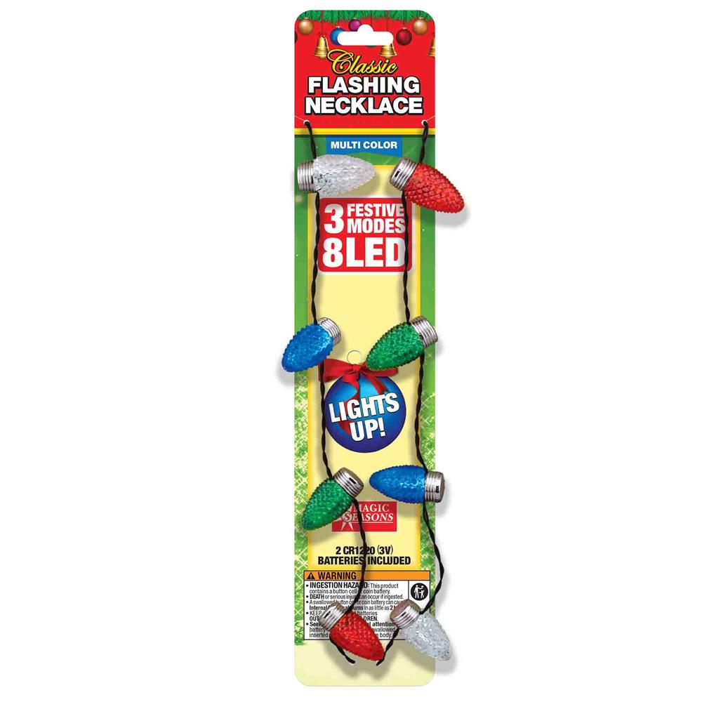 Brighten up your holiday celebrations with the Holiday Classic Bulb Flashing Necklace! This festive necklace features classic holiday bulb designs that light up with vibrant, flashing LED colors. Whether you're at a holiday party, parade, or just celebrating the season, this necklace adds a fun and sparkling touch to your look. Get into the holiday spirit and light up the night with this festive accessory!