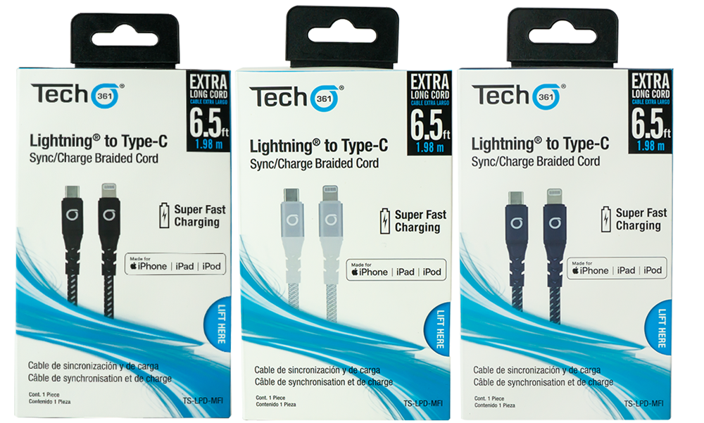 Stay connected with the Apple Certified 6.5' Lightning to Type-C Cord. This durable, long cable ensures fast charging and data transfer for your Apple devices. Designed with a peggable display for easy retail presentation.